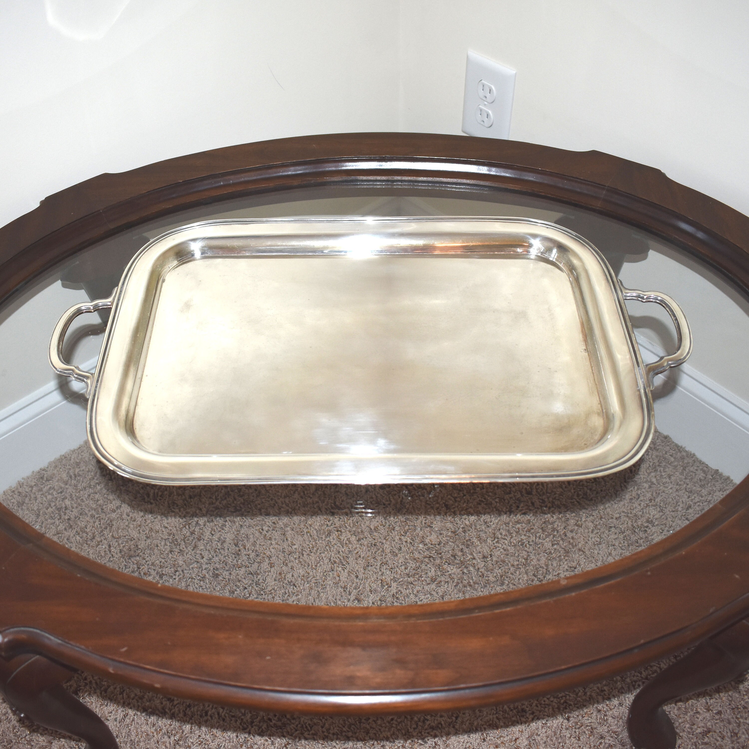 Exquisite vintage sterling silver tea tray by Fisher Sterling in pattern number 2801. The tray measures approximately 23.5" by 14" and weighs 70 troy ounces. Light surface scratches; otherwise, very good estate condition.